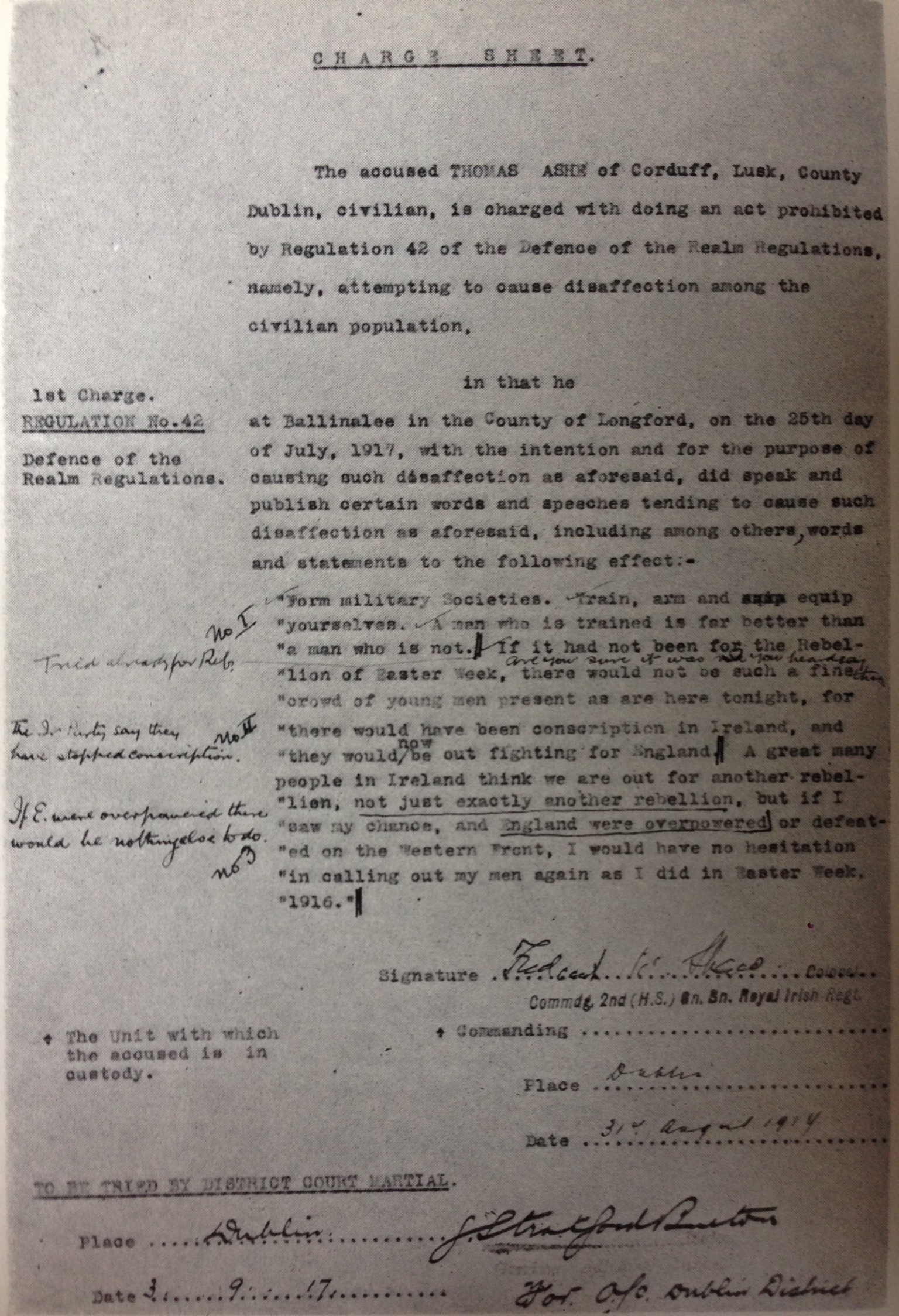 ChargeSheet ← Previous Next → Notes by Thomas Ashe on court-martial charge sheet, 1917 Like Loading...