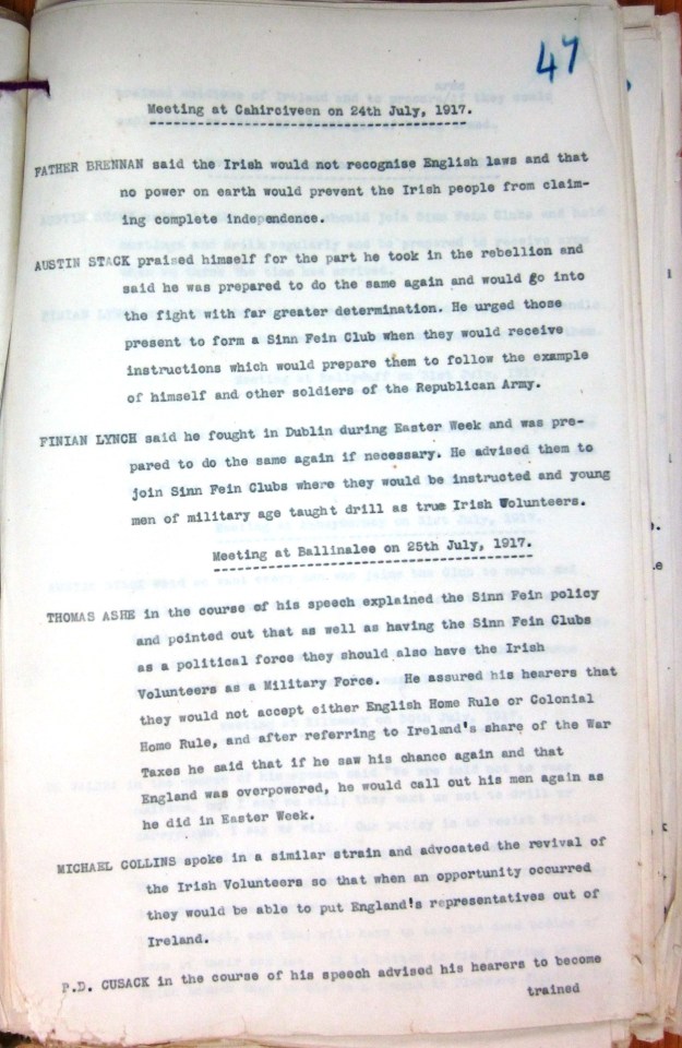 RIC Notes on Thomas Ashe Speech 1917 RIC notes on Thomas Ashe speech at Ballinalee 25th July 1917 Like Loading...